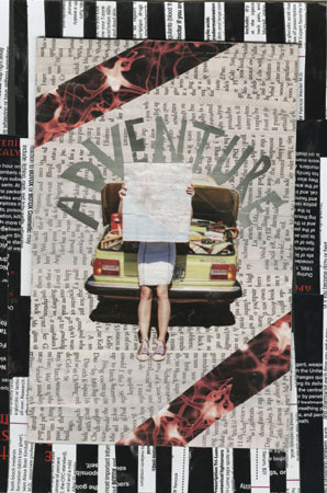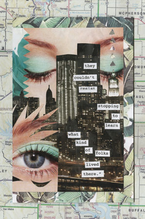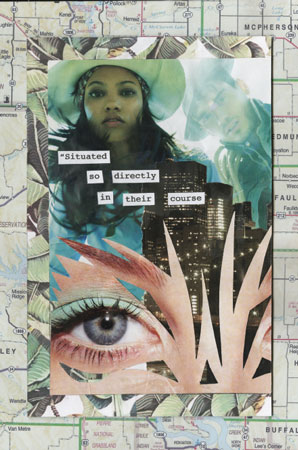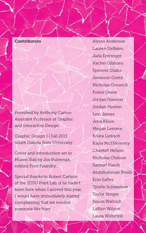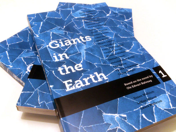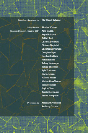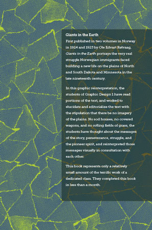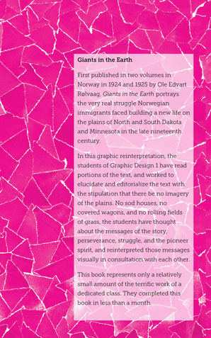 In this project, students are given text from the novel Giants in the Earth by O. E. Rölvaag and asked to re-imagine the story in a combination of text and imagery that presents the story in a new context. Students read and design a section of the text in a collaborative book created by everyone in the course. I ask them to be deliberate in their visual choices and leave the brief open other than page sizes, and the one stipulation that there be no wagon wheels, dug-out houses, bison or other imagery of the frontier. The message in the story is one of struggle against the elements to succeed, and there are present day parallels that I ask them to draw and editorialize in the pages of the book.